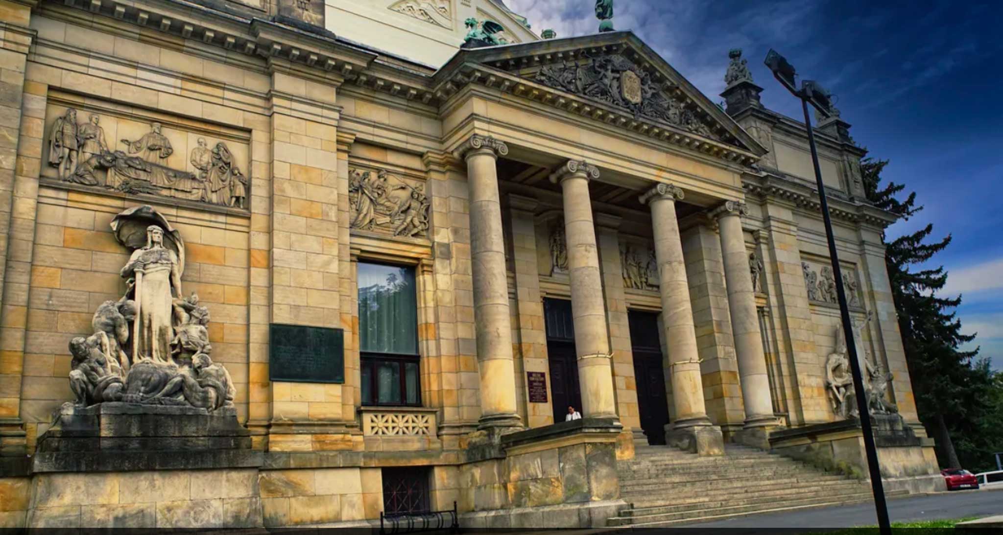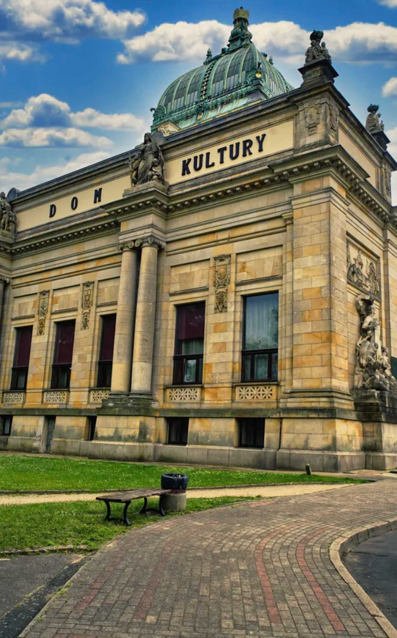 Idąc dalej, docieramy do monumentalnego budynku dzisiejszego Miejskiego Domu Kultury. Powstał on w latach 1898–1902 jako Oberlausitzer Ruhmeshalle – Górnołużycka Hala Chwały – oraz Kaiser-Friedrich-Museum, poświęcone pamięci cesarza Fryderyka III i historii regionu. Zaprojektował go architekt Hugo Behr z Görlitz. Obiekt wzniesiono w stylu secesyjnym, z charakterystyczną kopułą i dekoracyjną fasadą. Po 1945 roku, gdy Zgorzelec znalazł się w granicach Polski, budynek zyskał nową funkcję jako centrum życia kulturalnego miasta. Do dziś odbywają się tu koncerty, wystawy i festiwale.