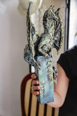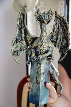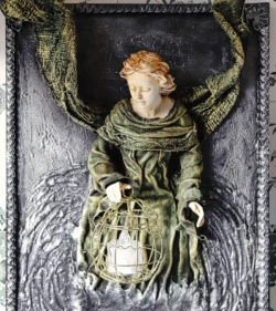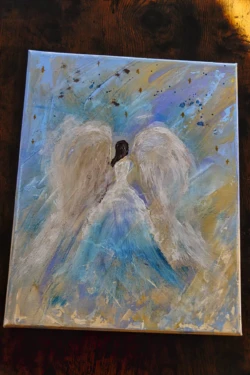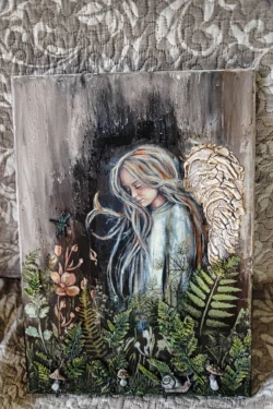 Jednym z takich dzieł jest rzeźba przedstawiająca anioła wychodzącego z wody. Jest to przykład pracy, która powstała na płótnie, wykorzystywanym do malowania, dostępnym w popularnych sklepach. Cała rzeźba została ręcznie wykonana z materiałów, takich jak stare koszulki, które artystka starannie wkomponowała w strukturę płótna. Efekt końcowy jest niesamowicie kreatywny, a sama praca łączy różnorodne techniki, od odlewu głowy, po ręczne malowanie i pigmentowanie, które nadają całości wyjątkowego charakteru.