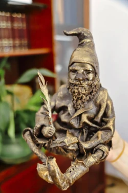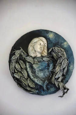 Ein Beispiel für ein solches Werk ist eine Skulptur, die einen Engel zeigt, der aus dem Wasser emporsteigt. Diese Arbeit wurde auf einer handelsüblichen Malleinwand geschaffen und vollständig von Hand gefertigt – unter anderem aus alten T-Shirts, die kunstvoll in die Struktur eingearbeitet wurden. Das Ergebnis ist ein faszinierend kreatives Werk, das verschiedenste Techniken vereint – vom Gießen des Kopfes über das manuelle Bemalen bis hin zum Pigmentieren, das der Skulptur ihren besonderen Charakter verleiht.