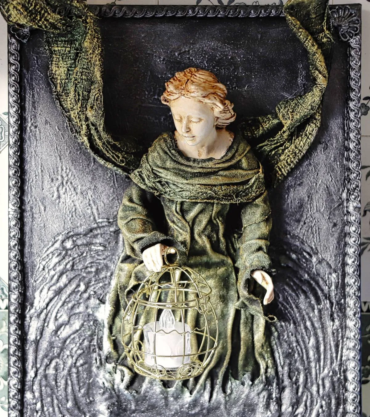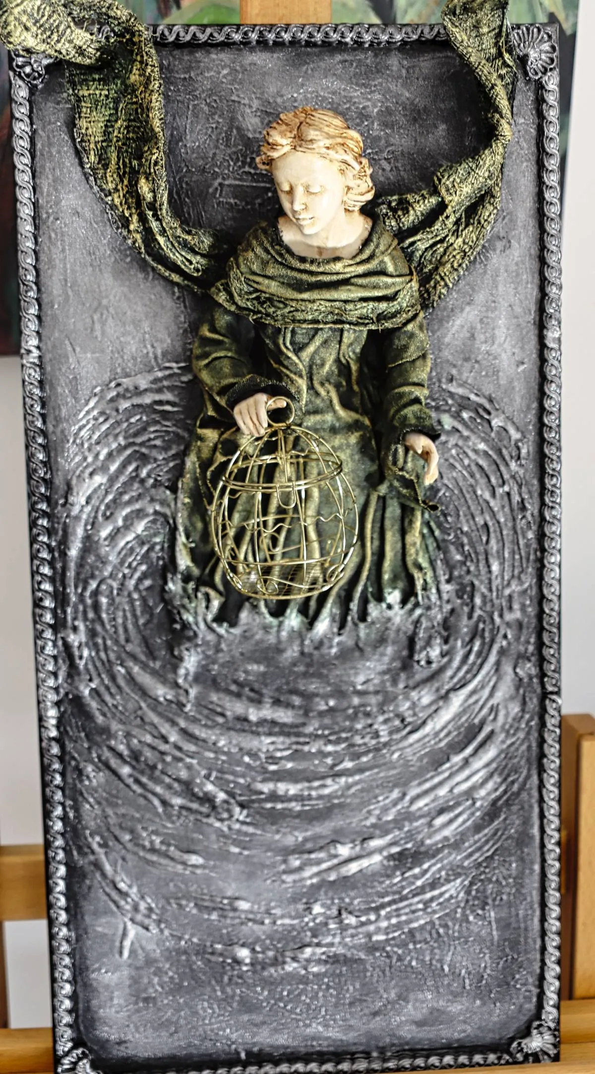 Ein Beispiel für ein solches Werk ist eine Skulptur, die einen Engel zeigt, der aus dem Wasser emporsteigt. Diese Arbeit wurde auf einer handelsüblichen Malleinwand geschaffen und vollständig von Hand gefertigt – unter anderem aus alten T-Shirts, die kunstvoll in die Struktur eingearbeitet wurden. Das Ergebnis ist ein faszinierend kreatives Werk, das verschiedenste Techniken vereint – vom Gießen des Kopfes über das manuelle Bemalen bis hin zum Pigmentieren, das der Skulptur ihren besonderen Charakter verleiht.
