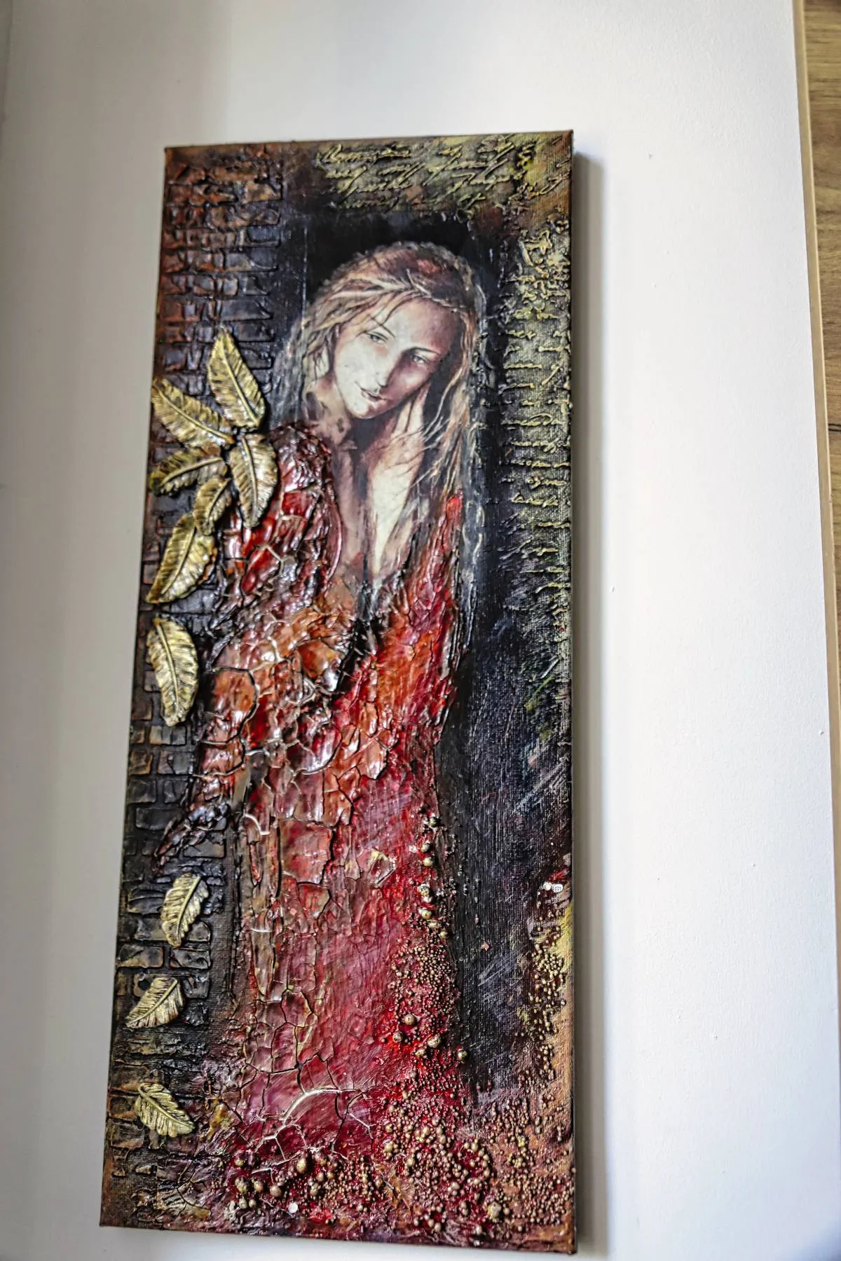 Jednym z takich dzieł jest rzeźba przedstawiająca anioła wychodzącego z wody. Jest to przykład pracy, która powstała na płótnie, wykorzystywanym do malowania, dostępnym w popularnych sklepach. Cała rzeźba została ręcznie wykonana z materiałów, takich jak stare koszulki, które artystka starannie wkomponowała w strukturę płótna. Efekt końcowy jest niesamowicie kreatywny, a sama praca łączy różnorodne techniki, od odlewu głowy, po ręczne malowanie i pigmentowanie, które nadają całości wyjątkowego charakteru.