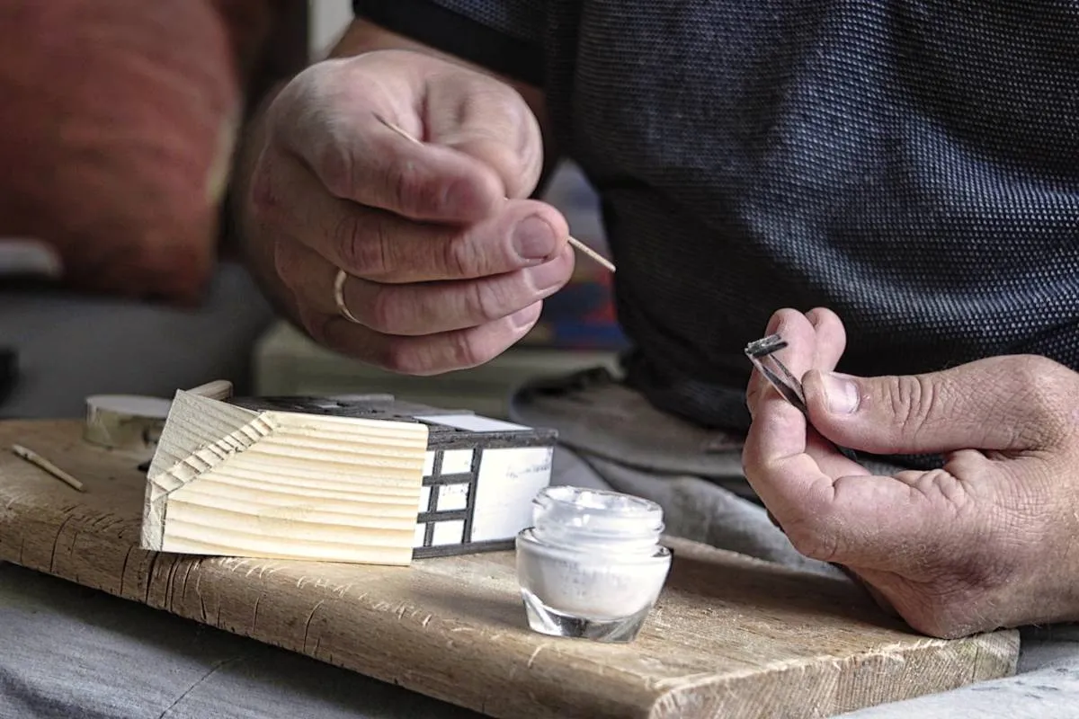 Inspiriert von dieser Entdeckung beschlossen Anton und seine Frau, Miniaturmodelle dieser charakteristischen Häuser anzufertigen. Sie fertigten einige kleine Holzhäuschen und Wandhaken an, die schnell bei den Bewohnern der Region Anklang fanden. Nach und nach begannen sie mit einer größeren Produktion – ihre Leidenschaft entwickelte sich zu einem kleinen Familienunternehmen. Jedes dieser Häuschen ist ein echtes handwerkliches Kunstwerk, das Präzision und große Sorgfalt erfordert. Für die Herstellung eines Hauses benötigen sie drei bis vier Tage. Der Arbeitsprozess beginnt mit dem Zuschneiden kleiner Einzelteile, anschließend werden diese geschliffen, bemalt und zusammengesetzt. Jeder Arbeitsschritt – vom ersten Entwurf über die Bemalung bis hin zur finalen Montage – erfordert Geduld und Engagement.