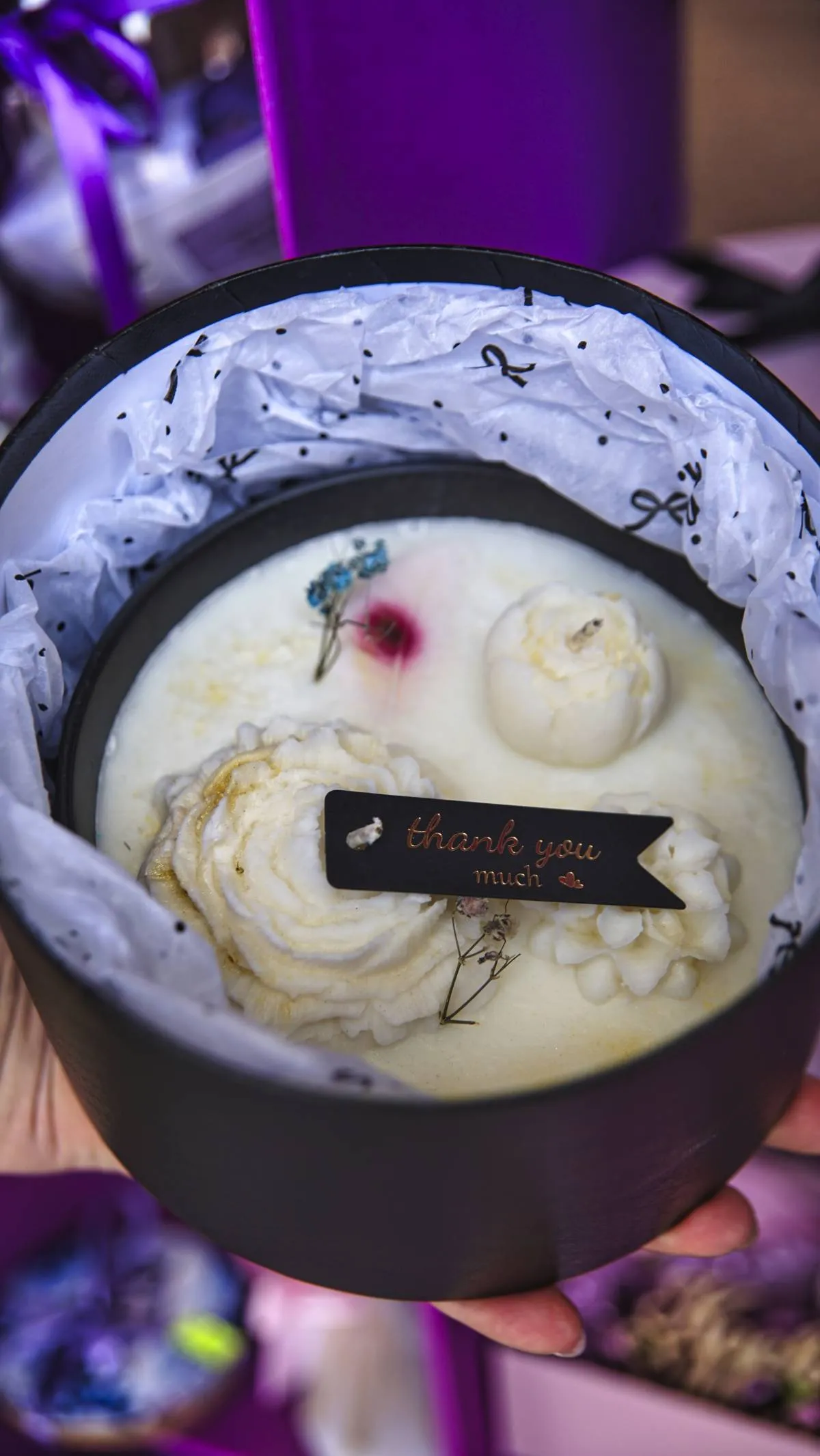 Ein weiteres Markenzeichen ihrer Produkte ist die außergewöhnliche Ästhetik. Anfangs stellte sie Kerzen in Muffinform her, die wie kleine Kuchen mit Früchten aussahen. Aufgrund gesetzlicher Änderungen, die den Verkauf von kerzenähnlichen Lebensmitteln untersagen, musste sie ihr Konzept anpassen. Heute bietet sie vielfältige Formen an – besonders beliebt sind die Flowerboxen, bei denen die Blumen aus Wachs gefertigt sind und somit niemals verwelken. Ergänzt werden diese durch getrocknetes Schleierkraut, das sich besonders gut konservieren lässt und eine langlebige, schöne Komposition ergibt.