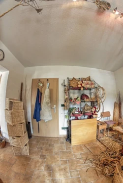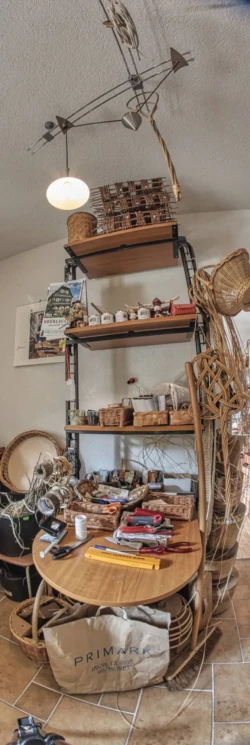 Die Werkstatt ist zwar klein, aber perfekt ausgestattet für alle Schritte der Handarbeit – vom Vorbereiten des Materials bis zum fertigen Produkt. Viel Werkzeug braucht es nicht: Scharfe Messer, robuste Schneidgeräte und ein paar Hämmer genügen, um langlebige, funktionale und gleichzeitig ästhetische Flechtwerke herzustellen. Besonders bemerkenswert ist, dass Thomas Scheffel die verwendete Weide selbst anbaut. Dadurch ist er unabhängig von externen Lieferanten und kann die Qualität seiner Materialien und Arbeiten vollständig kontrollieren. Wer möchte, darf gern einen Blick auf die eigene Weidenplantage werfen – die Grundlage seiner Kunst.