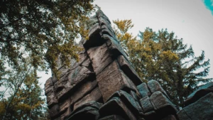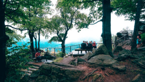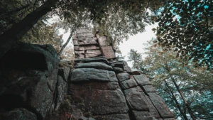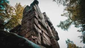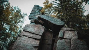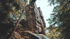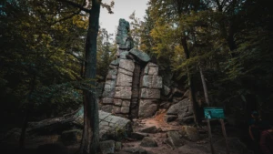 Dalej droga prowadzi do Krzywych Baszt – skał przypominających wieże warowni, powstałych w wyniku erozji i działania wiatru. Tuż obok znajduje się Narzeczeński Kamień, związany z legendą o dwojgu zakochanych, którzy nie mogli być razem. Kamień miał być symbolem ich uczucia, a według podań do dziś przynosi szczęście parom, które go odwiedzą.