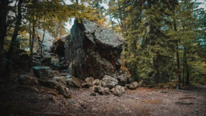 Szlak prowadzi następnie ku Zbójeckim Skałom – grupie granitowych formacji, które natura ukształtowała przez miliony lat. Nazwa pochodzi od legend o zbójnikach, którzy mieli tu ukrywać się przed strażnikami i napadać na kupców zmierzających przez górskie przełęcze. Dziś to malowniczy punkt widokowy z panoramą na doliny i szczyty.