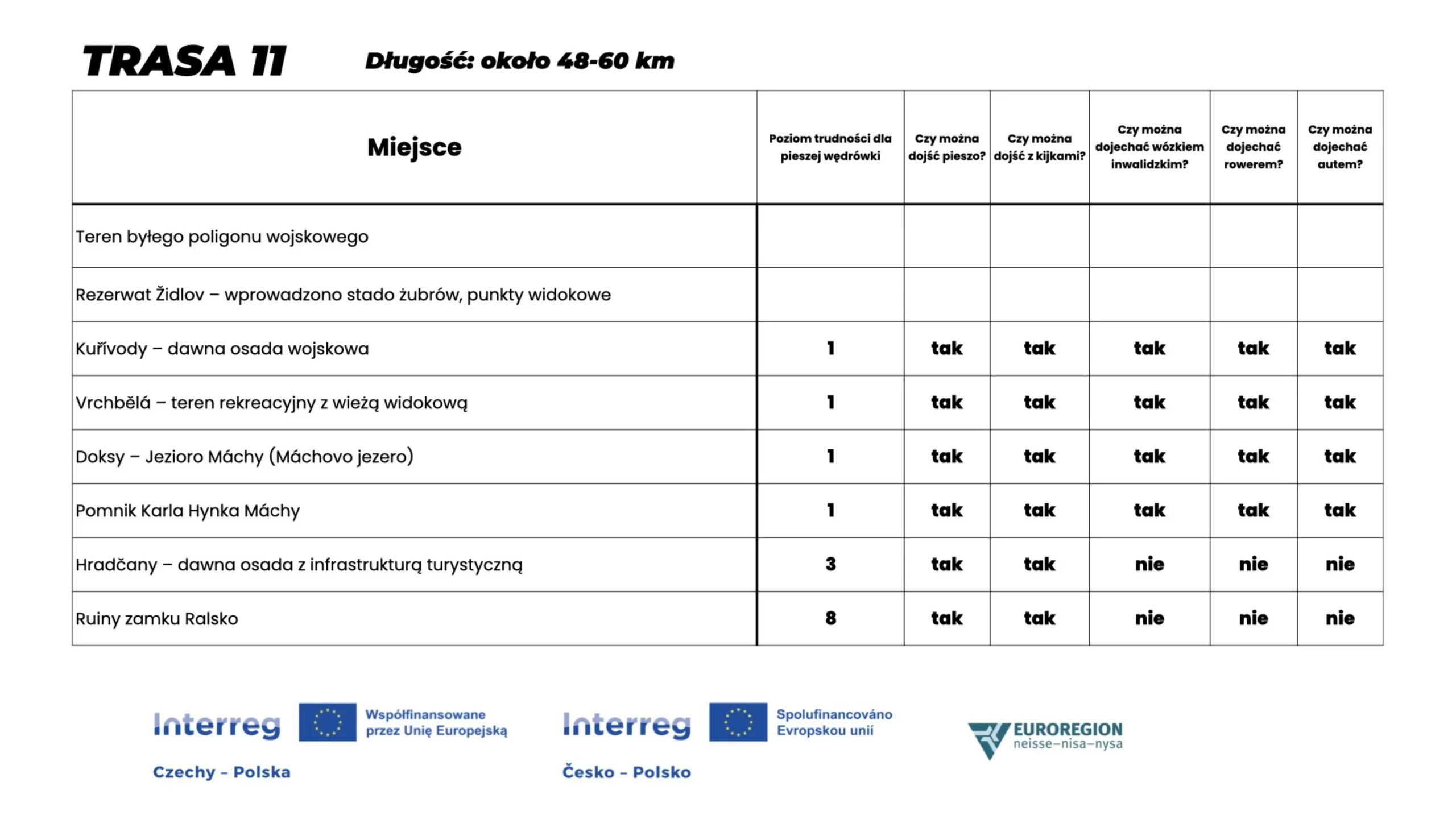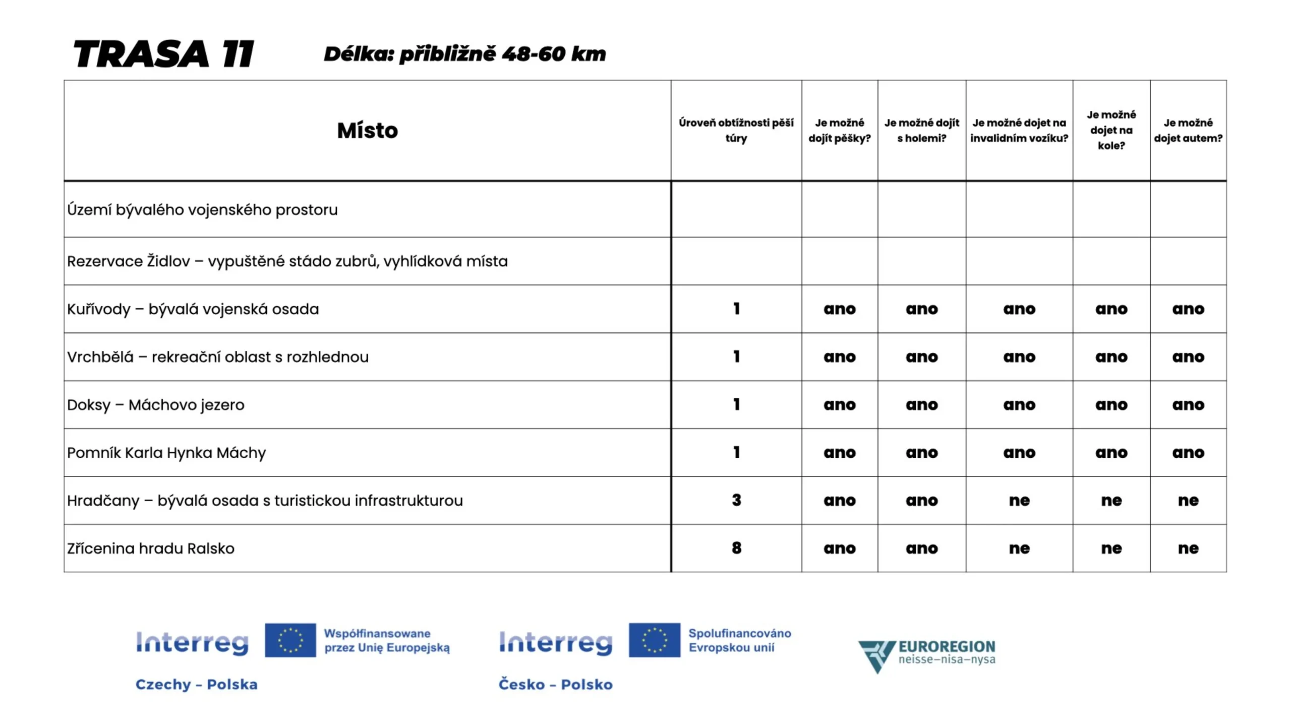 Trasa 11 je cestou místem, které se z vojenského prostoru proměnilo v krajinu přírody a historie. Setkání se zubry, tajemné jezírko a ruiny hradu Ralsko ukazují, že příroda dokáže znovu získat své místo a dát dávným prostorům nový smysl.