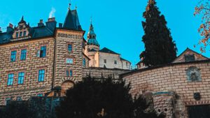 Na zakończenie trasa prowadzi do Frýdlantu, jednego z najpiękniejszych miast północnych Czech. Największą atrakcją jest tu potężny zamek i pałac Frýdlant, którego historia sięga XIII wieku. To jedna z pierwszych w Europie rezydencji udostępnionych turystom – już w XIX wieku można było zwiedzać tu wnętrza. Zamek łączy w sobie gotycką warownię, renesansowy pałac i barokowe dodatki, a jego wieża dominuje nad całą okolicą.