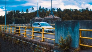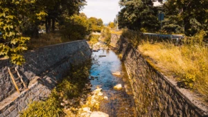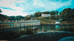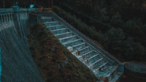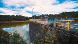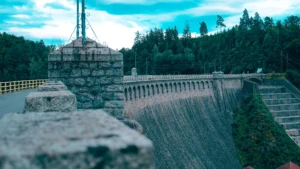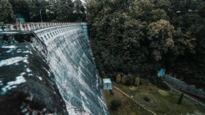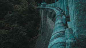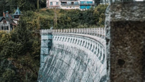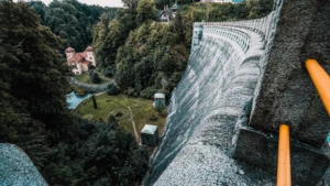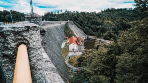 Kilkaset metrów dalej czeka na nas monumentalna Zapora Leśniańska. Została zbudowana na rzece Kwisie w latach 1901–1905, aby chronić okolice przed powodziami. To jedna z najstarszych zapór wodnych na Dolnym Śląsku i do dziś pełni funkcję retencyjną. Dzięki niej powstało Jezioro Leśniańskie, które stało się także atrakcją turystyczną i miejscem rekreacji. Tama robi ogromne wrażenie – jej kamienne mury wznoszą się na wysokość 45 metrów i rozciągają na ponad 130 metrów długości.