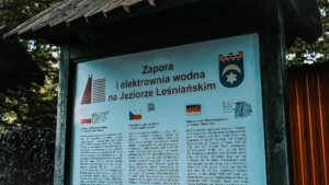 Jen pár set metrů dál na nás čeká monumentální Leśniańská přehrada, vybudovaná na řece Kwise v letech 1901–1905. Chrání okolí před povodněmi a patří k nejstarším přehradám Dolního Slezska. Díky ní vzniklo Leśniańské jezero, které se stalo i oblíbeným místem rekreace. Přehrada je impozantní – její kamenné zdi se zvedají do výšky 45 metrů a táhnou se v délce přes 130 metrů.