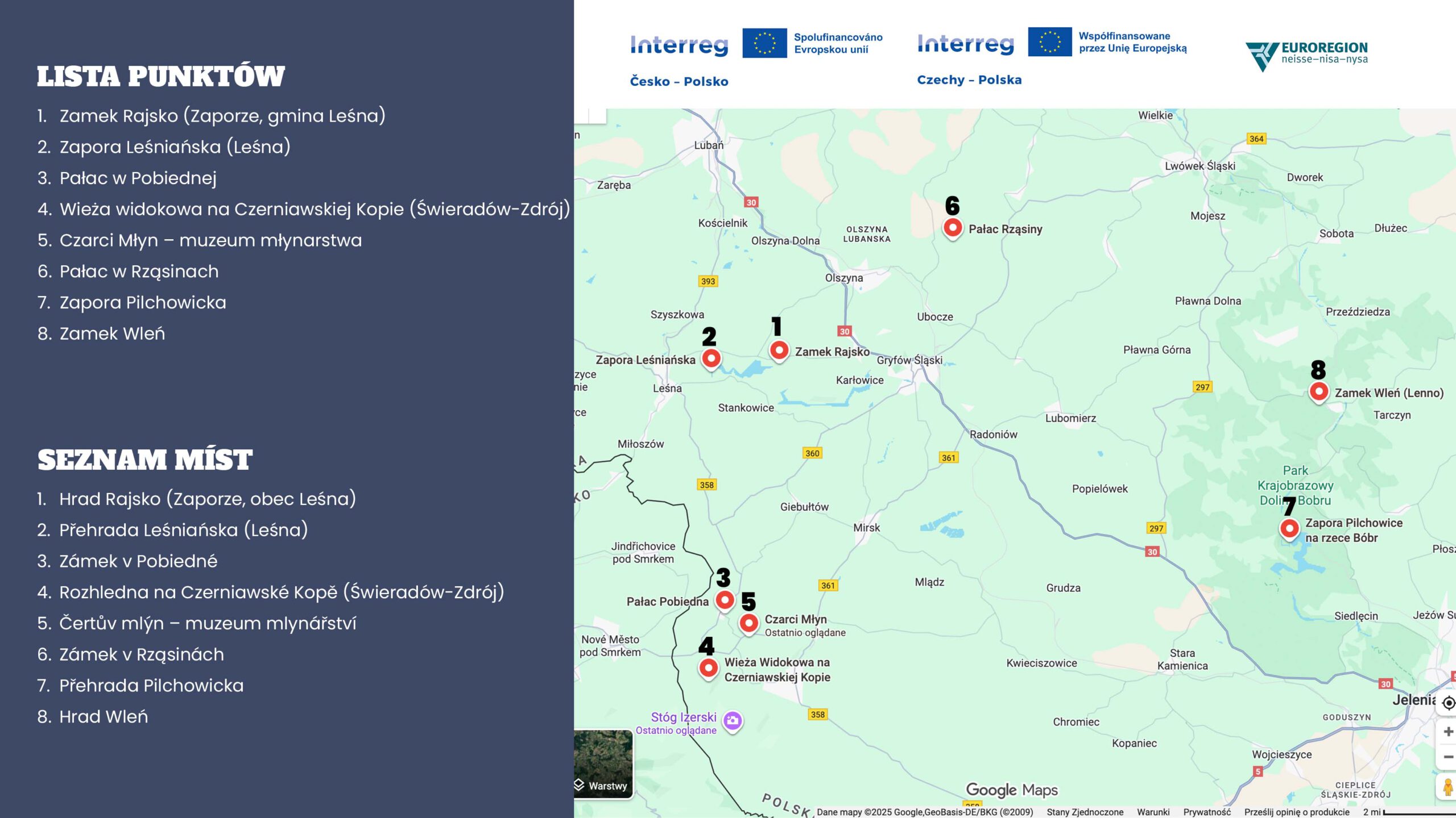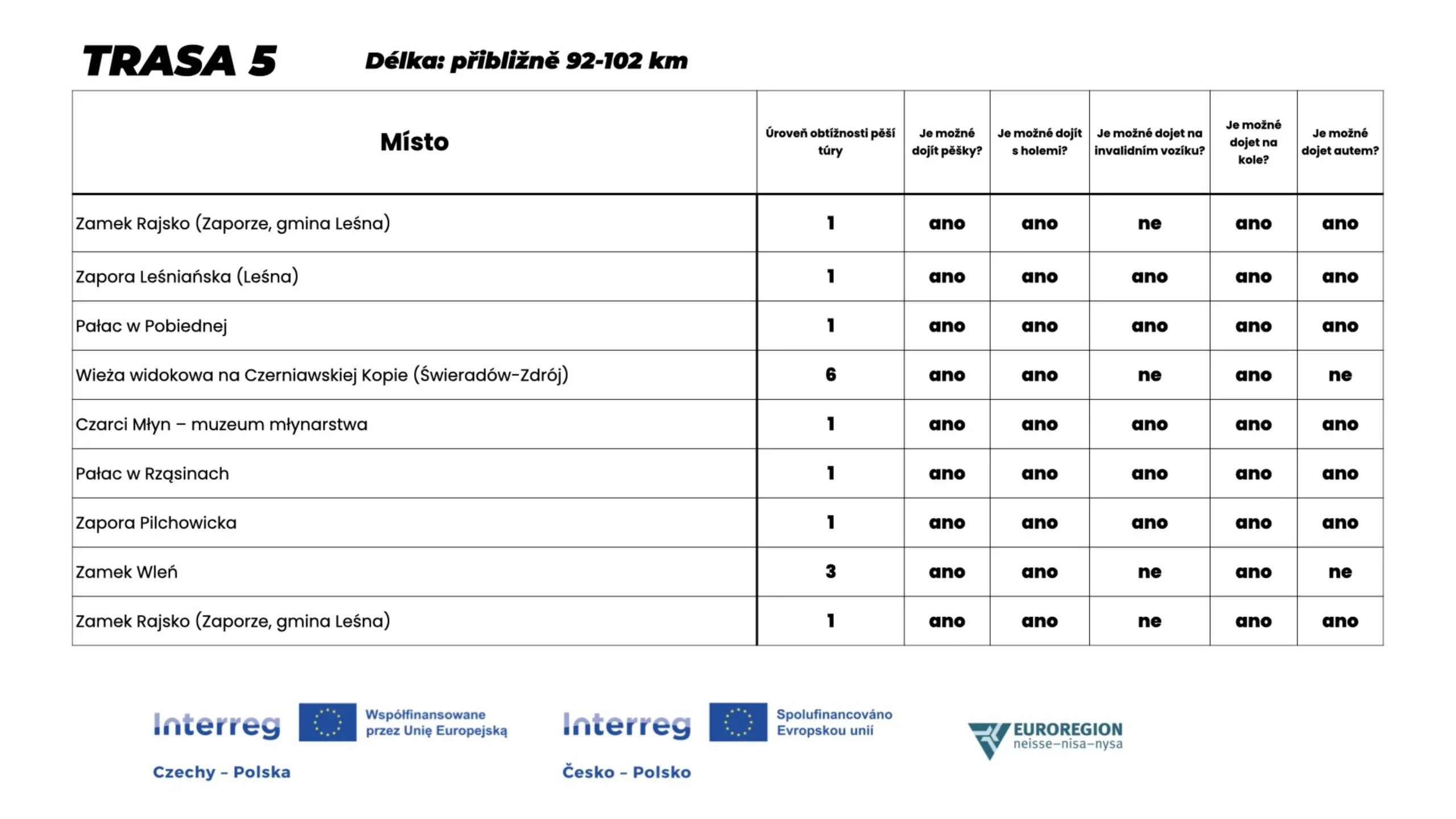 Trasa 5 je setkáním s romantickými ruinami, silou inženýrství a historií šlechtických sídel. Od malebného Rajska, přes monumentální přehradu a aristokratické Pobiednou až po nejstarší hradby Wleně – každý krok vypráví jinou kapitolu dějin Dolního Slezska.