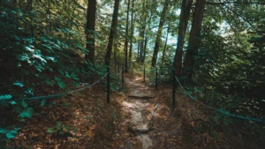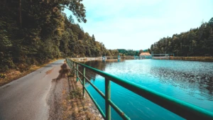 Kolejny etap to Skały Borowy Jar – Przełom Bobru. To tu rzeka Bóbr wcina się w granitowe skały, tworząc malowniczy przełom. Szlak prowadzi wzdłuż rzeki, a miejscami otwiera widoki na wysokie, porośnięte lasem urwiska. To jeden z piękniejszych fragmentów doliny.
