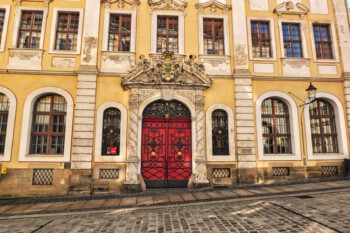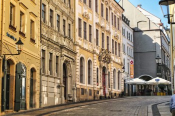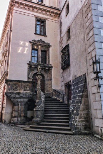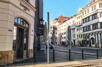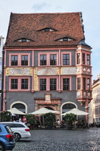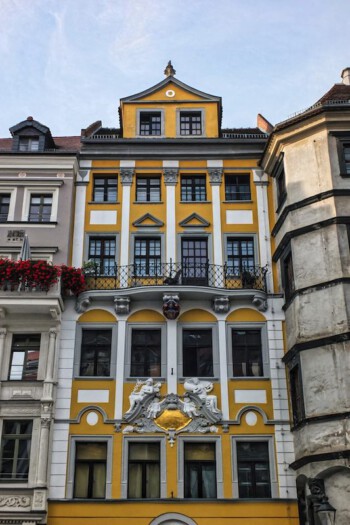 Wir beginnen unseren Rundgang durch die Altstadt von Görlitz mit der Neiβestraβe, die die Altstadtbrücke mit dem Unteren Markt verbindet. Die Via Regia, die im Mittelalter eine der wichtigsten Straßen Europas war, kreuzte diese Straße. Hier kamen alle durch: Händler, Soldaten und Pilger. Und wer einen Betrieb an der Strecke hatte, konnte leichter reich werden, denn die Kunden kamen in Scharen. Deshalb gibt es in dieser Straße auch so prächtige Stadthäuser. Eines der markantesten ist Nr. 20, wo die Malereien an der Fassade besonders auffällig sind. Das Gebäude hat gotische Mauern und ist von außen barock. Sein Besitzer hatte das Recht, Bier zu brauen, und nutzte dafür die tiefen Keller, die sich in diesem Gebäude befinden. Das relativ schlichte Portal verweist auf die Renaissance, und die Gemälde über den Fußböden zeigen das Akanthusblattmotiv. Dies war in der Kunst des 17. Jahrhunderts sehr beliebt. Viele Jahre lang waren die Gemälde unsichtbar, verblasst und unter einer dicken Staubschicht verborgen. Sie wurden bei Restaurierungsarbeiten in den 1950er Jahren entdeckt. Die Gemälde stammen aus dem Jahr 1680, und heute befindet sich im Inneren ein Restaurant namens Acanthus, das seinen Gästen die tiefen Kellerräume zur Verfügung stellt.