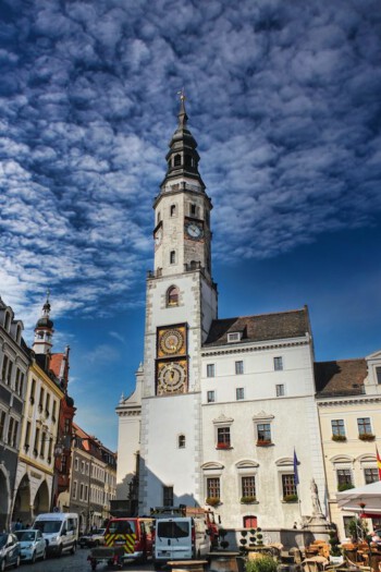 Podchodzimy teraz do podnóża wieży ratuszowej. Stoi tu perełka görlitzkiego renesansu, czyli wykonane z rozmachem schody ratuszowe. Stworzył je najwybitniejszy architekt tamtego okresu, czyli Wendel Roβkopf Starszy w latach 1537-38. Prowadziły one do skrzydła sądu w ratuszu. O jego siedzibie w tym miejscu mówi nam stojąca na cokole Justycja trzymająca wagę i miecz. Balkon z piaskowca to tak naprawdę ambona ogłoszeń. Tu wychodząc, sędzia ogłaszał wyrok dla skazańca, który w oczekiwaniu siedział skuty kajdanami na kamiennej ławie pod schodami. Posąg bogini powstał 50 lat po wykonaniu schodów. Podobnie jak ambona te 2 dzieła sztuki zostały na czas II wojny światowej umieszczone w magazynie. W 1952 roku miasto przedstawiło kopię, a oryginały wróciły tu po restauracji w roku 1962. Dzisiaj te kopie można obejrzeć przechodząc drzwi do byłego sądu w ratuszu.