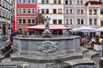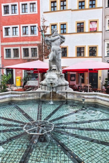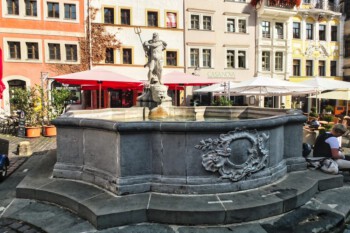 W rynku widzimy też fontannę. Jest to barokowa Fontanna Neptuna stworzona w 1756 roku. Za nią, całą zachodnią pierzeję rynku stanowią budynki Urzędu Miejskiego. Najnowszą częścią jest tzw. Nowy Ratusz. Powstał po przebudowie w 1900 roku, gdy starsze kamienice zamieniono w 1 gmach. Najbliżej tej budowli do neorenesansu. Na fasadzie umieszczonych jest 6 herbów miast, należących do Związku Sześciu Miast. Było to połączenie sił 6 górnołużyckich miast przeciwko rycerzom – rabusiom zagrażającym bezpieczeństwu okolicznych mieszkańców i przejeżdżający tędy kupców.