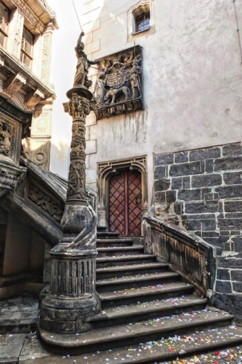Wir nähern uns nun dem Fuß des Rathausturms. Hier steht ein Juwel der Görlitzer Renaissance, das prächtige Treppenhaus des Rathauses. Sie wurden von dem berühmtesten Architekten der Zeit, Wendel Roβkopf dem Älteren, in den Jahren 1537-38 entworfen und führten zum Gerichtsflügel des Rathauses. Die Justizia, die auf einem Sockel steht und eine Waage und ein Schwert in der Hand hält, verrät uns seinen Sitz hier. Der Sandsteinbalkon ist eigentlich eine Kanzel für Ankündigungen. Hier verkündete der Richter auf dem Weg nach draußen das Urteil für die Verurteilten, die während des Wartens gefesselt auf einer Steinbank unter der Treppe saßen. Die Statue der Göttin wurde 50 Jahre nach dem Bau der Treppe angefertigt. Wie die Kanzel wurden auch diese beiden Kunstwerke für die Dauer des Zweiten Weltkriegs eingelagert. 1952 schenkte die Stadt eine Kopie, und die Originale kehrten nach ihrer Restaurierung 1962 hierher zurück. Heute kann man diese Kopien sehen, wenn man durch die Tür zum ehemaligen Gericht im Rathaus geht.