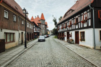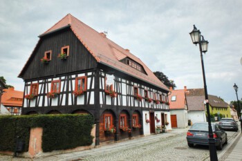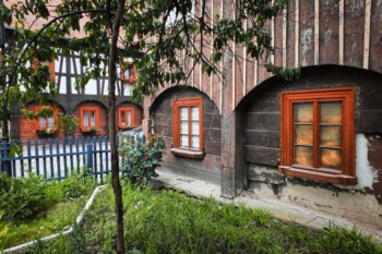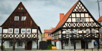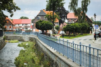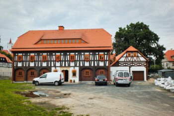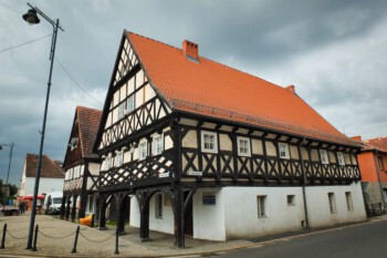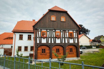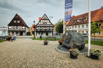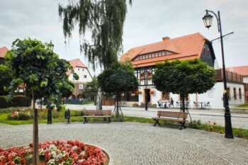 Wir fahren jetzt nach Bogatynia. In deutscher Zeit hieß die Stadt Reichenau. Heute ist sie nach Zgorzelec die größte Stadt des Bezirks. Sie liegt inmitten des so genannten "Turoszów-Sacks" und ist hauptsächlich mit dem Braunkohleabbau verbunden. Aber auch die Stadt selbst kann mit einigen touristischen Attraktionen aufwarten. Die Stadt verfügt weder über einen Marktplatz noch über eine Fußgängerzone. Im Zentrum der Stadt, wo früher die Waryńskiego-Straße verlief, kam es 2010 zu einer großen Überschwemmung, bei der viele Gebäude zerstört wurden. Nachdem die Infrastruktur und die Gebäude instandgesetzt worden waren, wurde der Name in "Zittauer Allee" geändert. Jetzt ist dieser Ort eine wichtige Fußgängerzone. Hier stehen viele für die Oberlausitz typische Fachwerkhäuser. In Bogatynia gibt es die größte Konzentration dieser Art von Architektur in Polen. Was ist so besonders an diesen Häusern? Nun, sie waren immer in einen Wohn- und einen Wirtschaftsteil unterteilt und hatten in der Regel zwei Stockwerke. Der Wohnteil war aus Holz mit einer Blockstruktur, während das Wirtschaftsteil aus Ziegeln bestand. Das erste Obergeschoss wurde in Fachwerkbauweise mit Lehmfachwerk errichtet. Das auffälligste Strukturelement sind die äußeren, hölzernen Strebepfeiler, auf denen das Gewicht der oberen Stockwerke ruht. Das einstöckige Blockhaus ist ein eigenständiger Raum und hätte theoretisch herausgezogen werden können, so dass das Haus auf diesen Pfeilern gestanden hätte. Dieses System wurde verwendet, weil viele Häuser kleine Webereien beherbergten. Und eine solche Werkstatt verursachte eine Menge Vibrationen, die die Struktur des Gebäudes gefährden konnten. Jahrhundert kamen solche Gebäude in Mode und wurden nicht nur von Handwerkern, sondern auch von den wohlhabenderen Schichten bewohnt. Je mehr Außenfachwerk, desto reicher war der Besitzer. Auf der Zittauer-Allee können wir viele solcher Gebäude sehen, die auf den ersten Blick sehr ähnlich aussehen, aber wenn man genau hinsieht, ist jedes von ihnen anders. Eines der Häuser, die nach der Flut umfassend restauriert wurden, ist das Uhrmacherhaus. Hier können wir eintreten, uns an einen Tisch im Restaurant setzen und ausruhen, bevor wir unsere Stadtbesichtigung fortsetzen.
